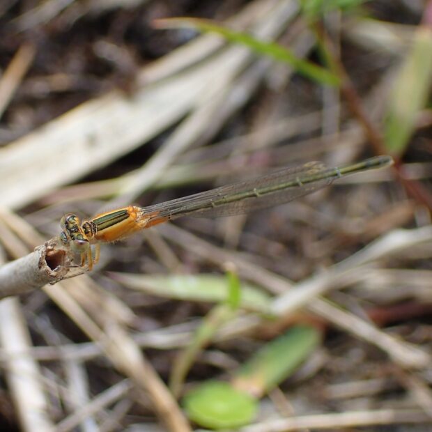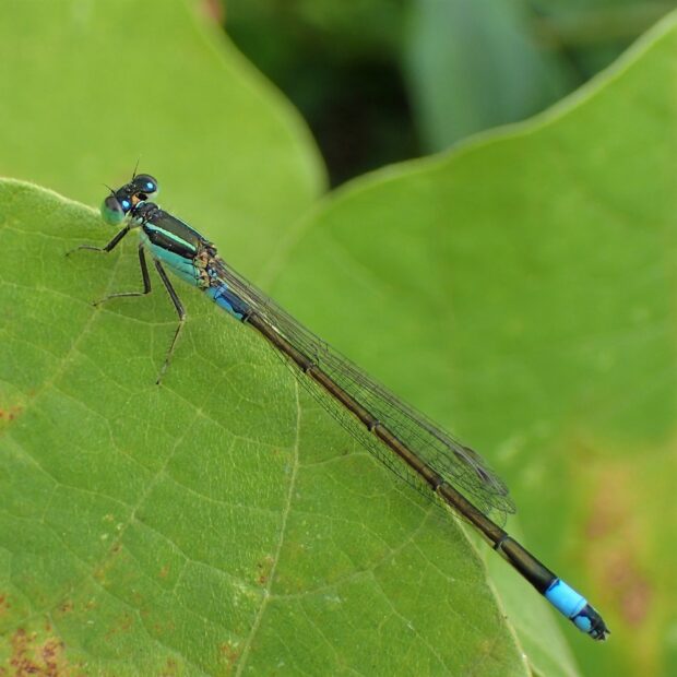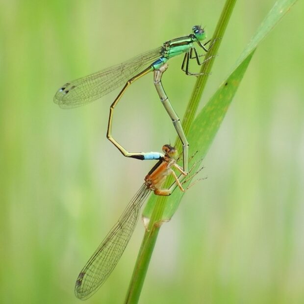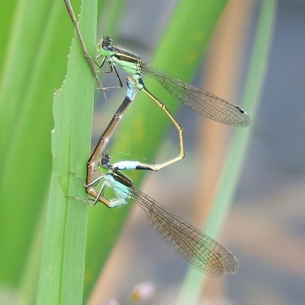 池の水草の間をふわりふわり飛んでいる小さなイトトンボ。 オスは胸と腹部の先が青くきれい!メスの色は、 オスと同じ色(同色型)と褐色(異色型)の2つのタイプがあります。 メスは水草に産卵します。