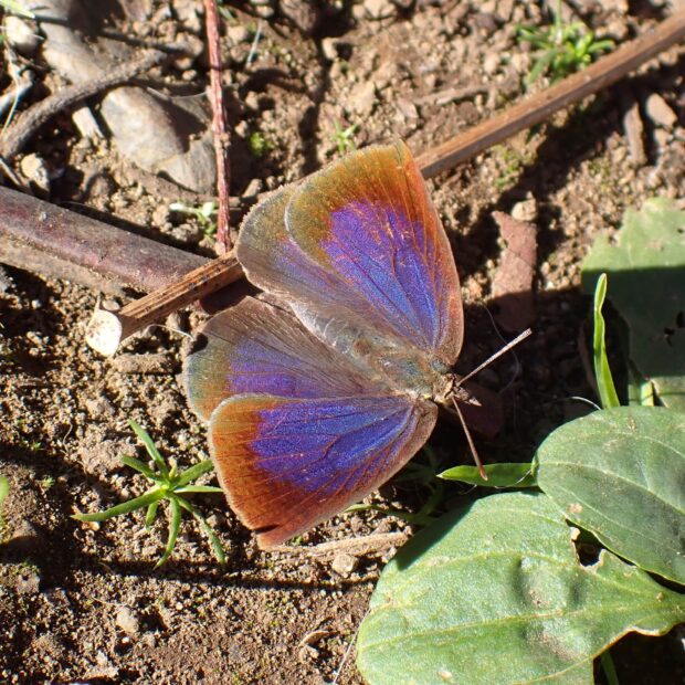 はねを広げると青紫色に輝くシジミチョウ。 はねをたたむと茶色で目立ちません。 幼虫はシイ、 カシ類やコナラなどの葉を食べて育ちます。 幼虫は体から栄養豊富な蜜を出してアリを誘い、 アリを用心棒にしています。