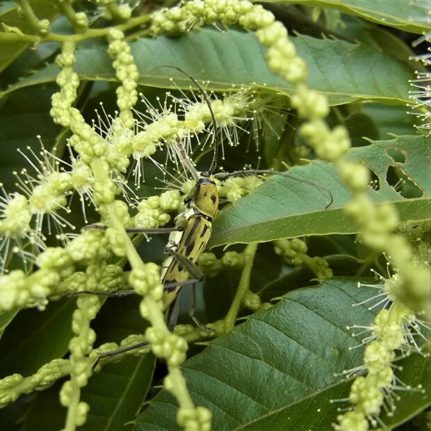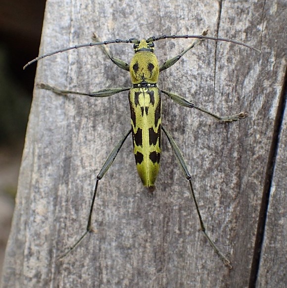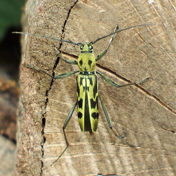 黄色い体に黒い模様があるトラカミキリの仲間。 薪(たきぎ)や伐採した木を忙しそうに歩きまわり、 クリやリョウブなどの花にもやってきます。 幼虫は乾燥した薪が好物です。