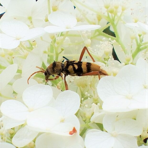 暖かい地域に住むカミキリムシ。 市街地の公園でも見られます。 黄色い体に黒い模様、 触角もそれほど長くなく、 アシナガバチのよう!?いろいろな花を訪れ、 広葉樹の枯れた木に集まります。