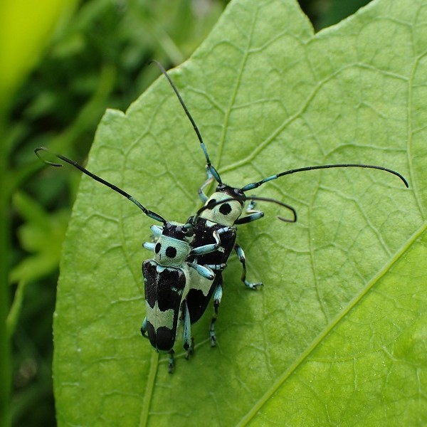 水色~黄緑色のきれいな色をしたカミキリムシ。 平地~山地に生息し、 カラムシ、 ムクゲなどで普通に見られます。 ラミーとはカラムシという草の仲間で、 繊維(布などの材料)をとるために輸入したもの。 ラミーカミキリはその草について来た中国からの外来種だと考えられています。