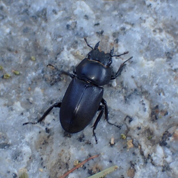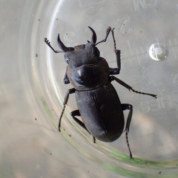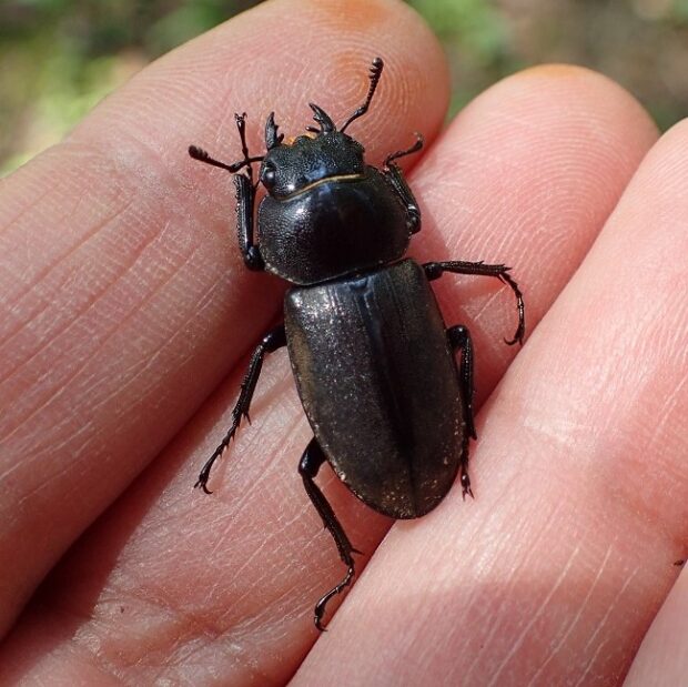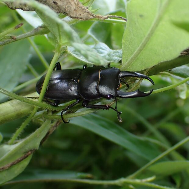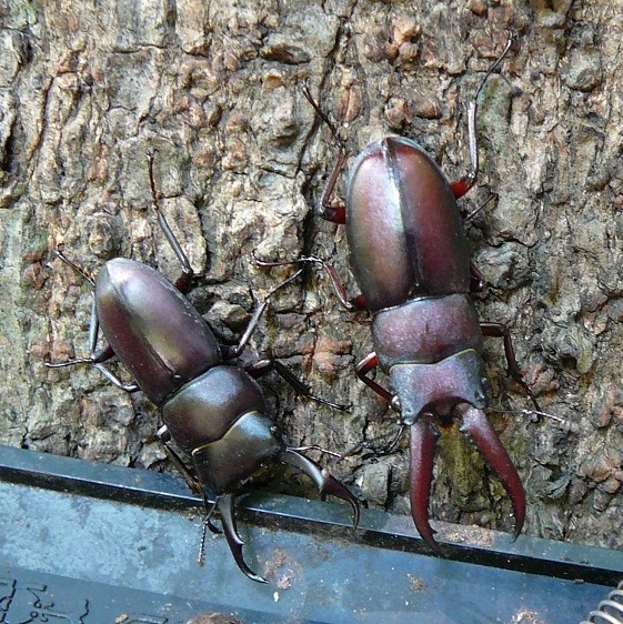 平べったく黒っぽい小さなクワガタムシ。 オスの大あごは体の大きさによって変化があります。 もっとも普通に見られるクワガタムシで、 市街地の公園でも見られます。 夜行性ですが、 昼間に樹液にやってくることがあります。