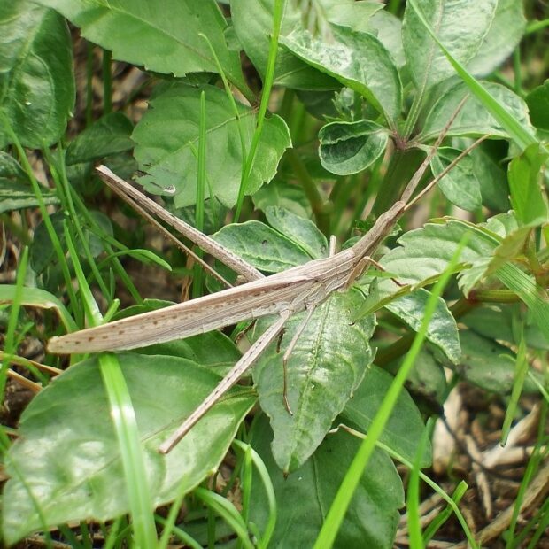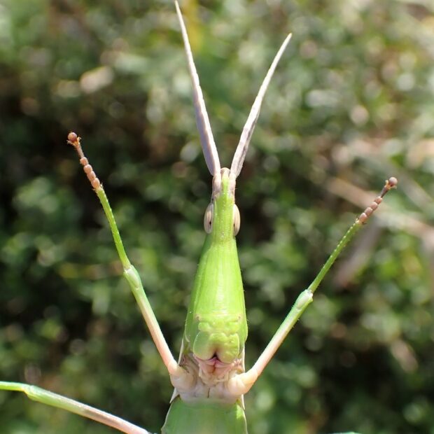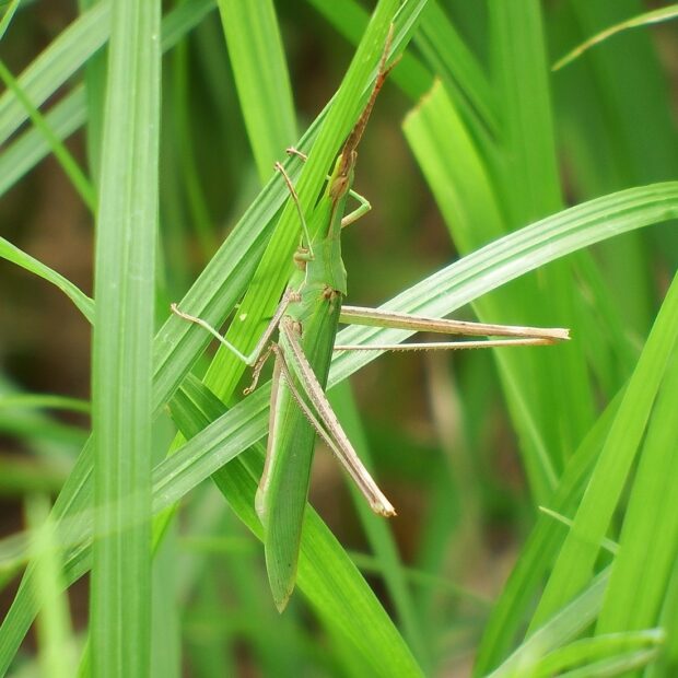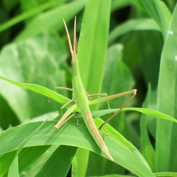 メスは大きくて迫力満点!草はらにすみ、 葉っぱと同じ緑色や茶色をしていますが、 たまにピンク色や黄色のものが見つかることがあります。 手で長い後ろあしをもつと、 体をすばやく上下に動かしおじぎをします。