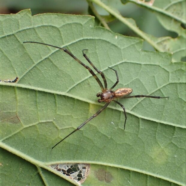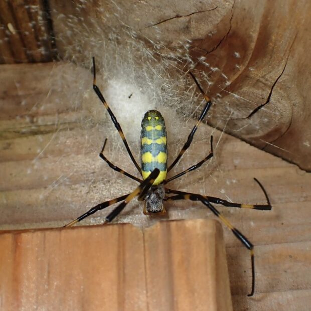 都市部から山地まで普通に見られるコガネグモの仲間。 秋になると大きな網になり、 うっかりしていると顔にクモの網がべったり。 光があたると金色に光ってみえます。 網は目の細かい馬蹄形で、 3重になっています。