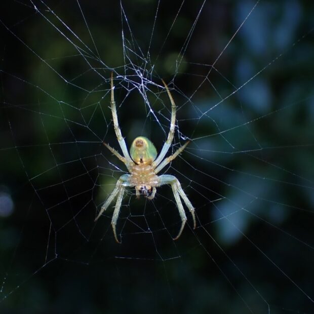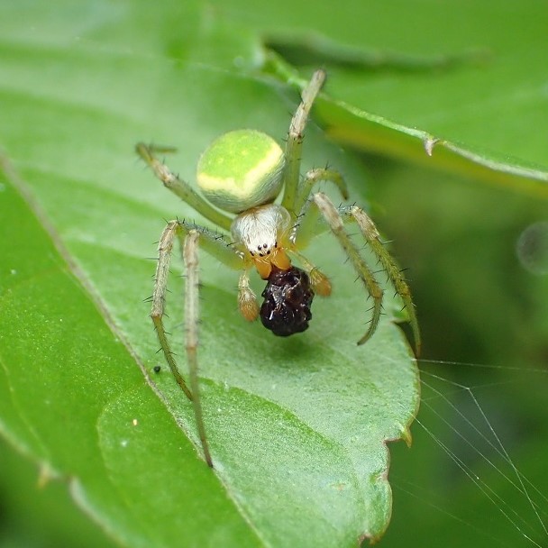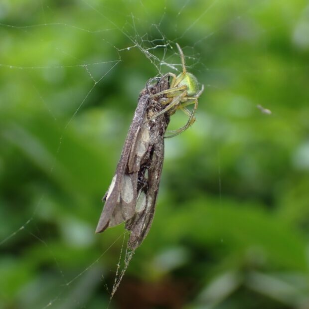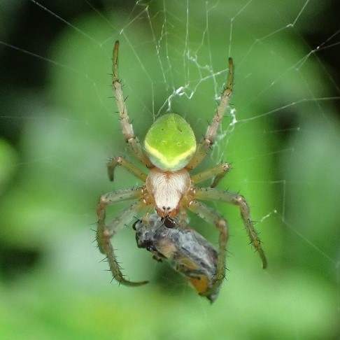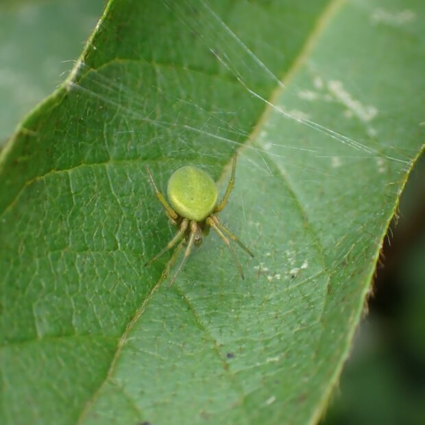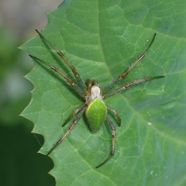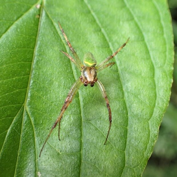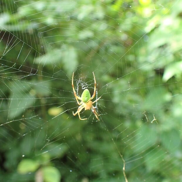 コガネグモの仲間。 お腹は緑色で黄色い線があるきれいなクモ。 京都や福井の一部ではハゼの実のことをサツマノミと呼び、 サツマノミに似ていることから名づけられました。 昼間は葉の上で休んでいることが多く、 夕方から円網を張ります。 市街地の公園や庭で見られます。