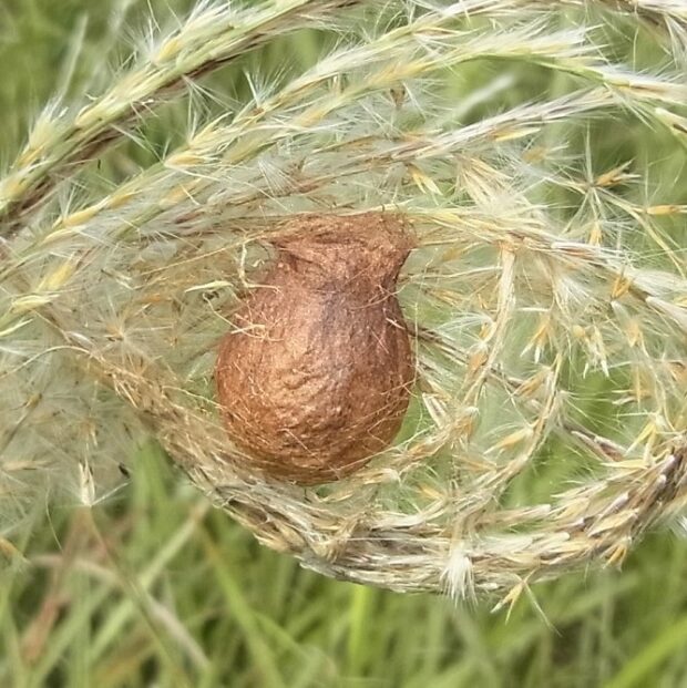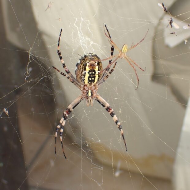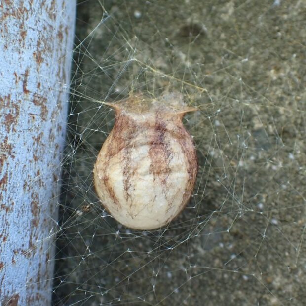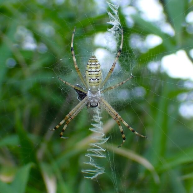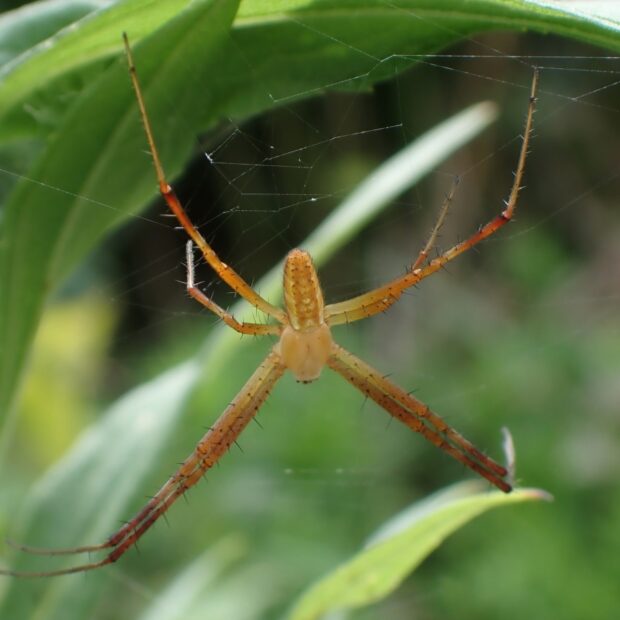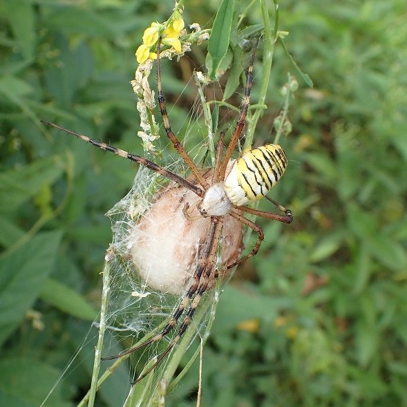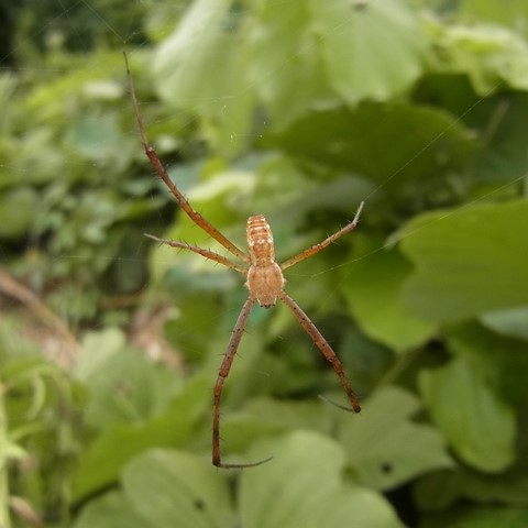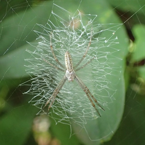 田んぼや明るい草地で見かけるコガネグモの仲間。 まるい網をはり、 網にはかくれ帯という白いギザギザしたものがついています。 かくれ帯は紫外線を反射し、 エサである虫を誘う他、 鳥などから網が破られるのを防ぐ役割もあるようです。