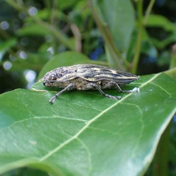 松林で見られる、 地味な色ながら美しいタマムシ。 タマムシの中では大型で、 縦に盛り上がった線があります。 幼虫は枯れたマツや切り株の中で、 3年ほどかけて育ちます。