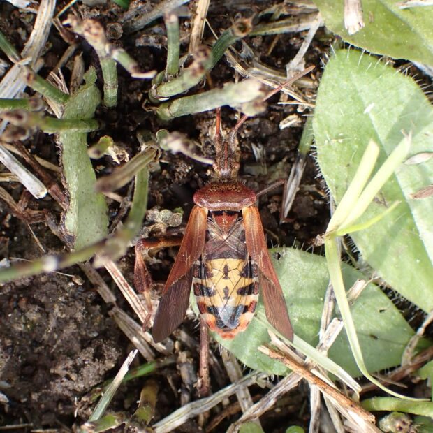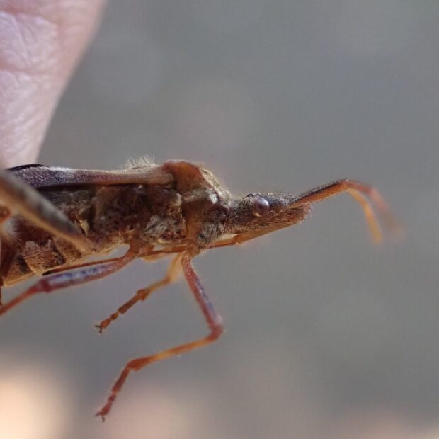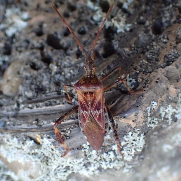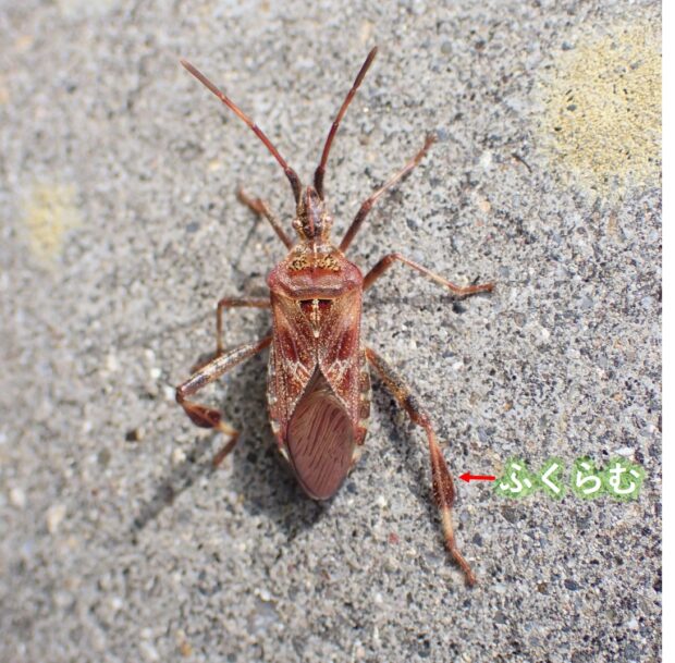 松で見られる北アメリカ原産のカメムシ。 2008年に東京で初めて見つかり、 分布を広げています。 はねは赤みがある茶褐色で複雑な模様があり、 後あしの脛節(けいせつ)に広がった部分があるのが特徴です。