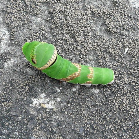 • 終齢幼虫。 幼虫が若いとき(4齢幼虫まで)は鳥のフンのよう。 ミカンの仲間の葉を食べる。