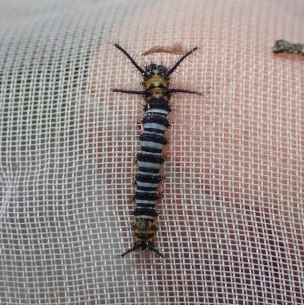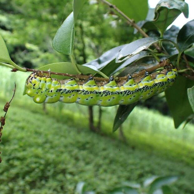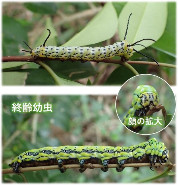 終齢幼虫は黄緑色の体に黒点が散らばる。