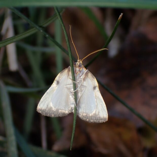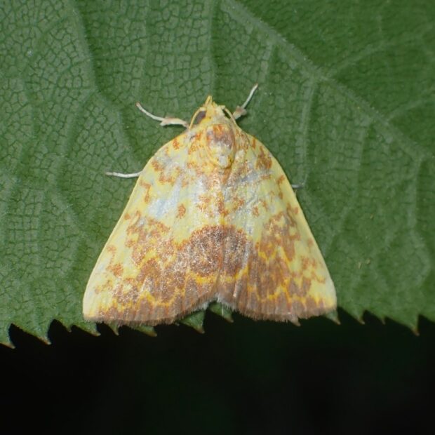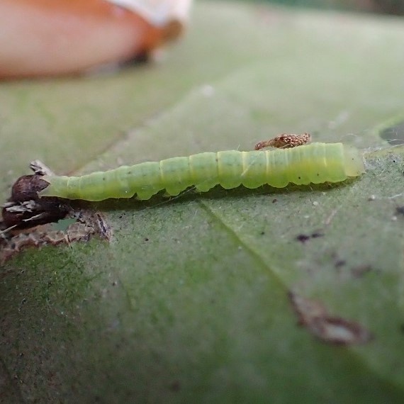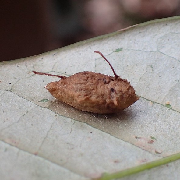 鮮やかな黄色に、 赤褐色の模様がある小さなリンガの仲間。 幼虫は葉の裏の主脈にいることが多く、 幼虫で越冬します。 繭は突起がある面白い形をしています。