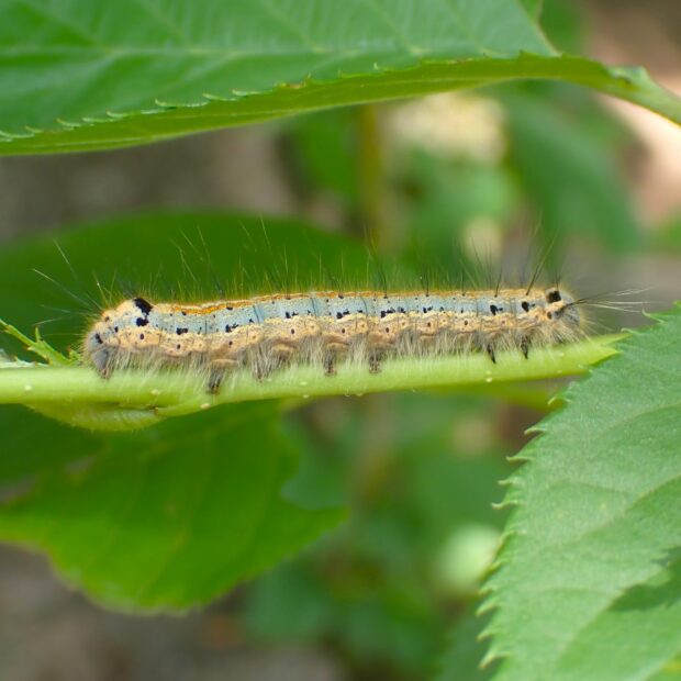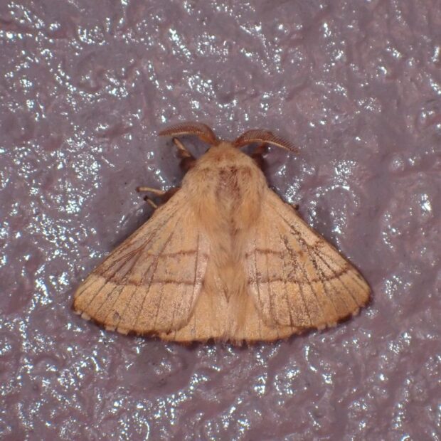 カレハガの仲間。 幼虫は、 テンマクケムシ(天幕毛虫)あるいはウメケムシと呼ばれます。 ウメやサクラの枝に、 糸でテントのように大きな幕をはって群がります。 幼虫が大きくなると分散し、 単独で行動します。 幼虫に毒はありません。