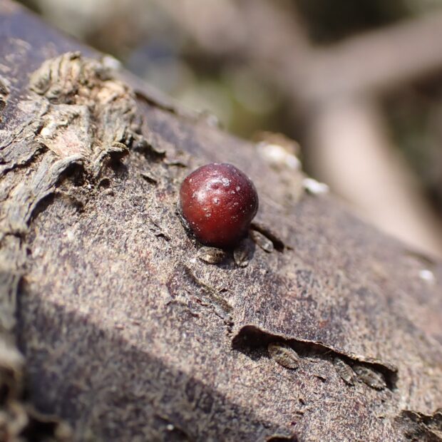 ウメなどバラ科の木につくカイガラムシ。 カイガラムシは、 針のような口吻(こうふん=細長い口の器官)を植物にさしこみ、 汁(師管液)を吸うカメムシの仲間。 メスは丸くあずき色で、 オスははねがありとても小さいです。 5月頃、 メスは体の下に産卵し、 5月下旬から6月に幼虫が出てきます。
