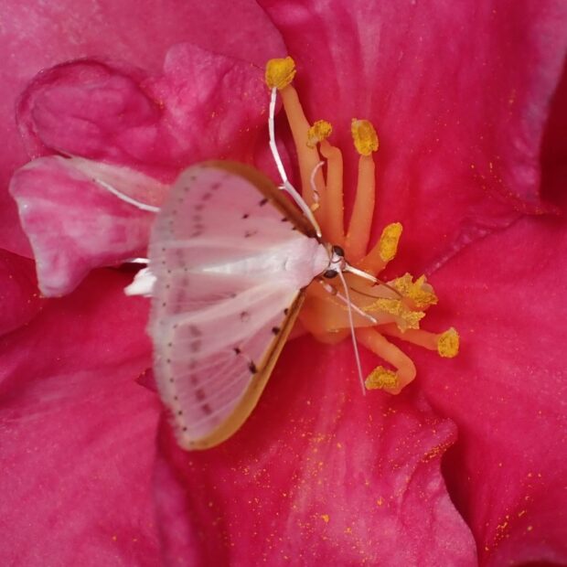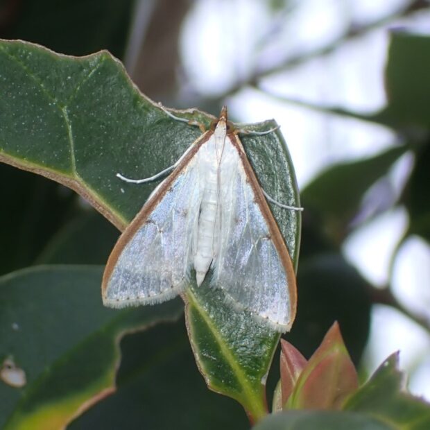 ツトガの仲間。 半透明の白いはねをもち、 前ばねのふちには赤褐色の筋があります。 人家周辺で見られる小さなガで、 キンモクセイなどの庭木にもやってきます。