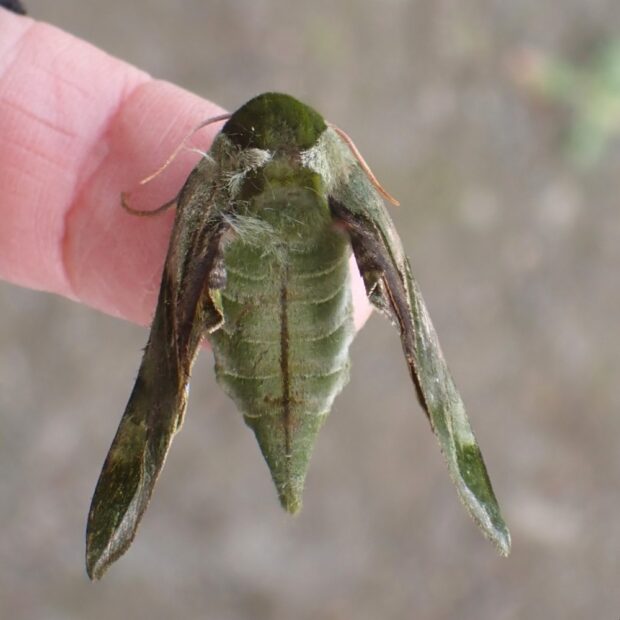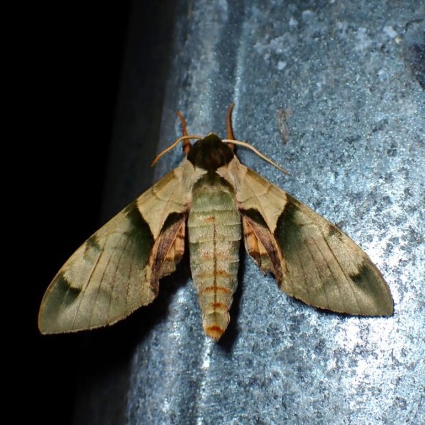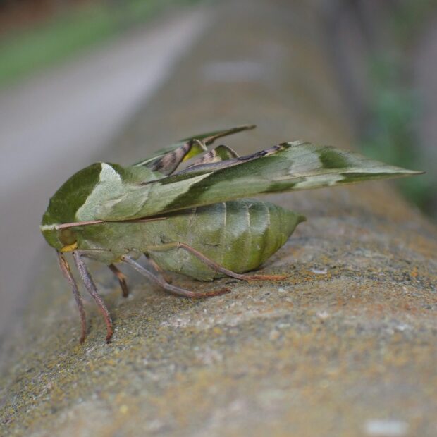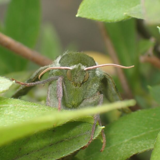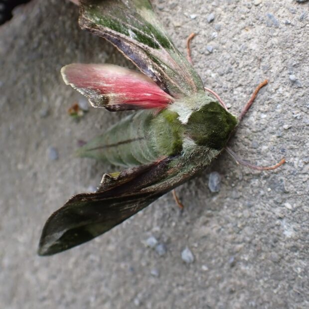 緑色で美しいスズメガの仲間。 後ばねは赤っぽい。 はねにモヤモヤした模様があることから「雲紋(ウンモン)」と名づけられたようです。 幼虫の体は緑色で、 背中と側面の斜めの線が特徴。