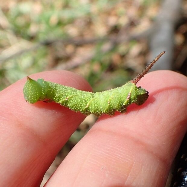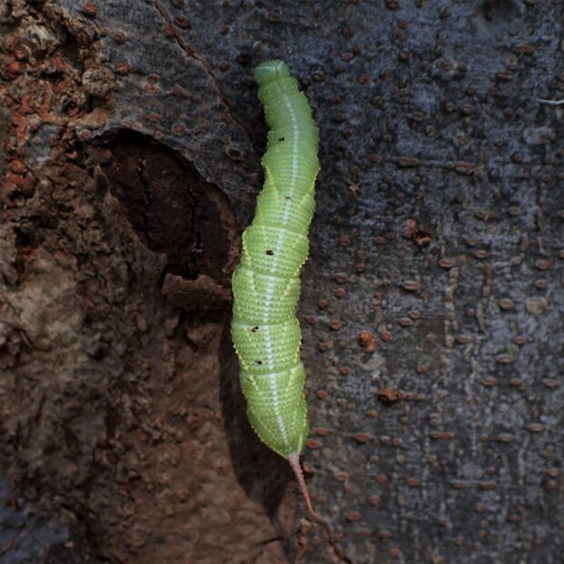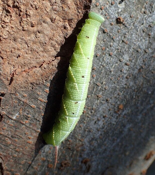 • 若い幼虫。 しっぽのような尾角(びかく)が赤く目立つ。