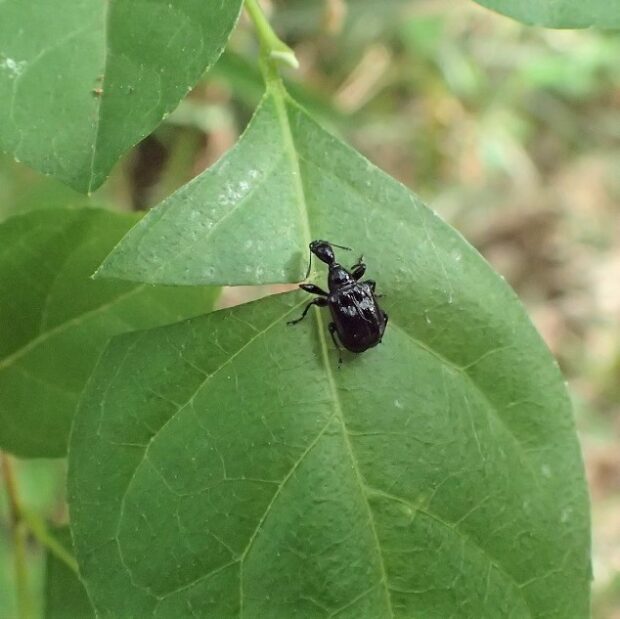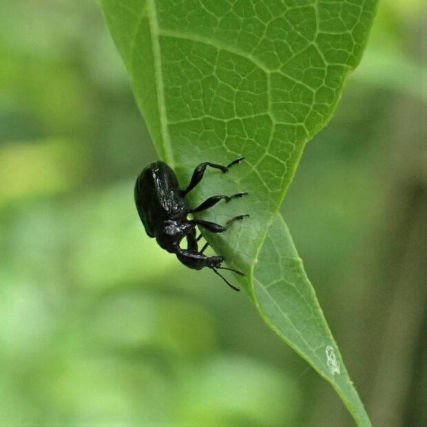 エゴノキで普通に見られる、 光沢のある真っ黒なオトシブミ。 エゴノキの葉を食べ、 オスがツルのように首(頭部)が長いことから「ツルクビ」と名づけられました。 ただし小型のオスは、 首がそれほど長くありません。