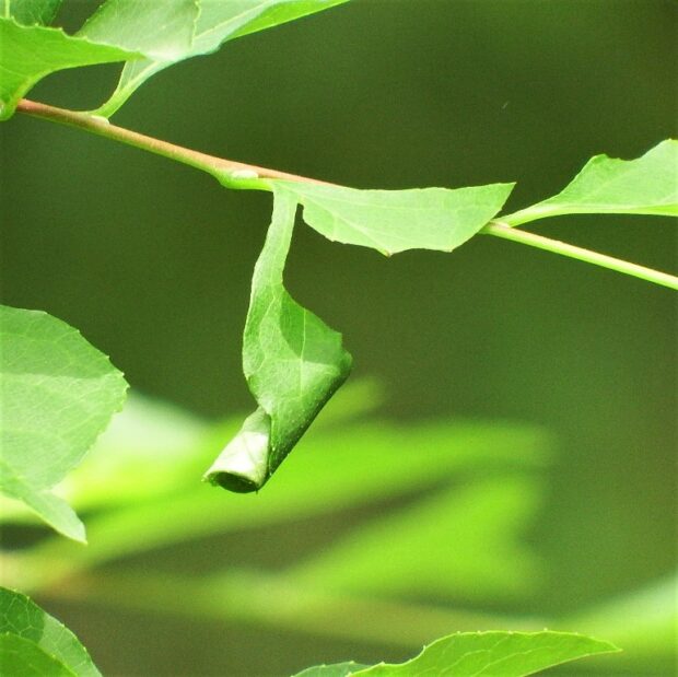 • メスが葉を折りたたみ巻き始める。 中に卵を産み、 完成には約1時間ほどかかる。