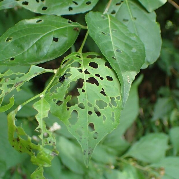 • 成虫が葉を食べたあと。 丸い穴がいっぱい。