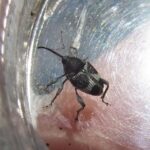 エゴノキで見られ、 花にもやって来る口吻(こうふん=細長く伸びた口の器官)が長いシギゾウムシ。 口が鳥のシギのくちばしのように長いので、 シギゾウムシと名づけられました。 メスはエゴノキの実に産卵し、 幼虫は実の中で育ちます。
