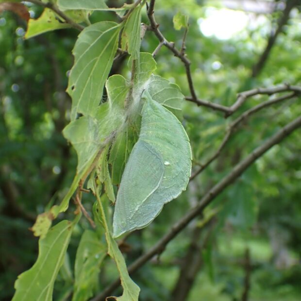 • カシの落ち葉の裏で越冬している幼虫。 エノキの葉裏に張り付いていることが多いが、 他の葉にもいる。