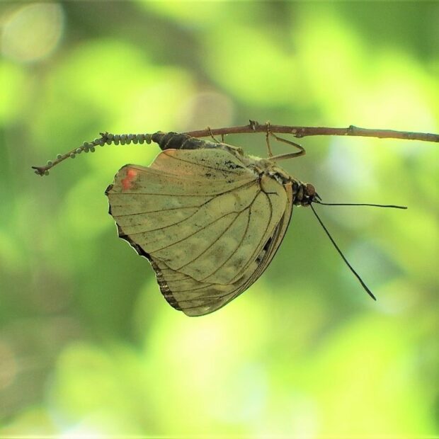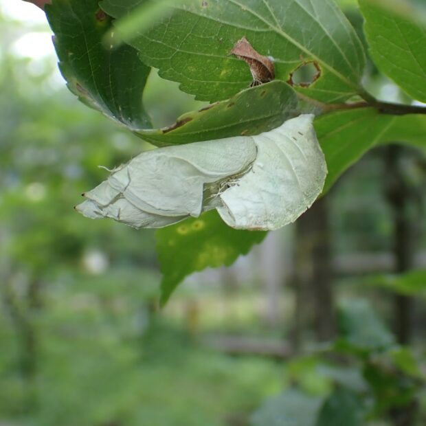 • 越冬幼虫。 エノキの根元に積もる枯れ葉をめくると見つかる。