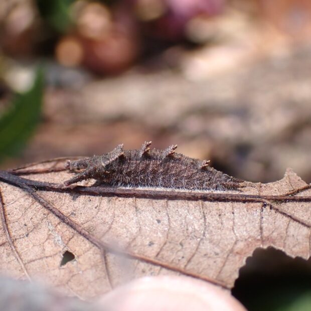 • 4齢幼虫。 エノキの落ち葉の裏で越冬。 越冬幼虫は枯れ葉色。 4対の突起がある。