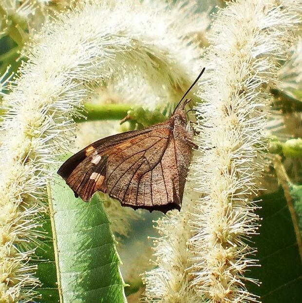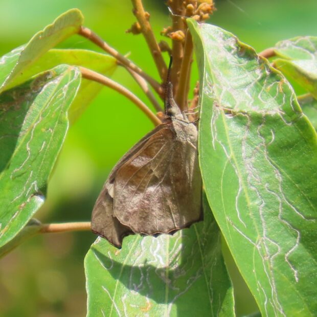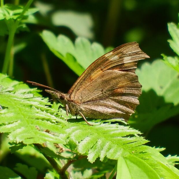 タテハチョウの仲間。 茶色のはねにオレンジと白の紋、 顔の先がとがり、 前ばねは角ばった独特の形をしています。 はねの裏は枯れ葉のよう。 成虫は6月頃あらわれますが、 暑い夏は休眠します。 まれに大発生することがあります。 (MT)