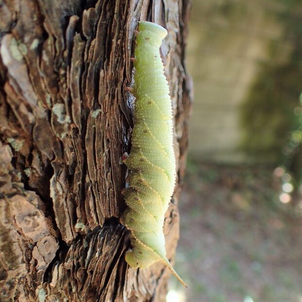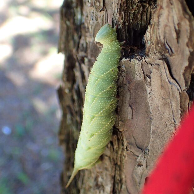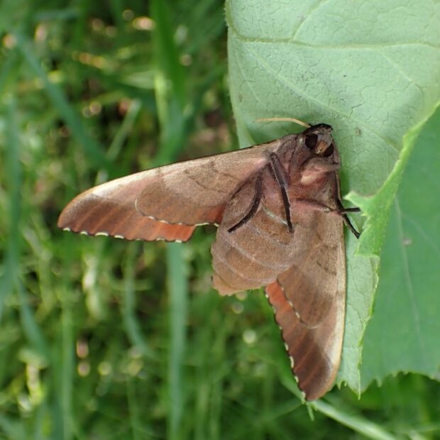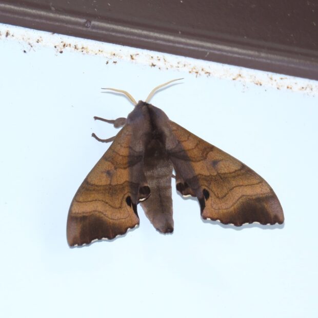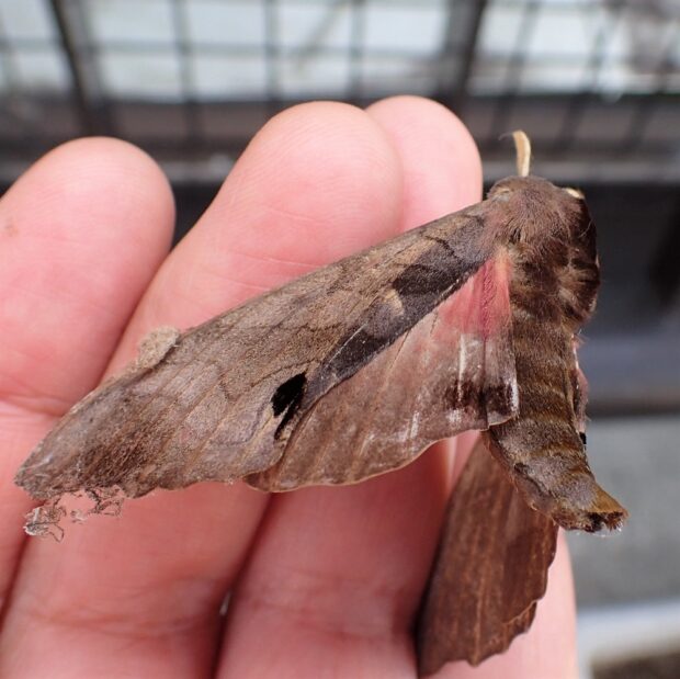 前ばねは波型模様で黒点があるスズメガの仲間。 後ばねは薄いピンク色をしています。 果樹園や雑木林周辺で見られます。
