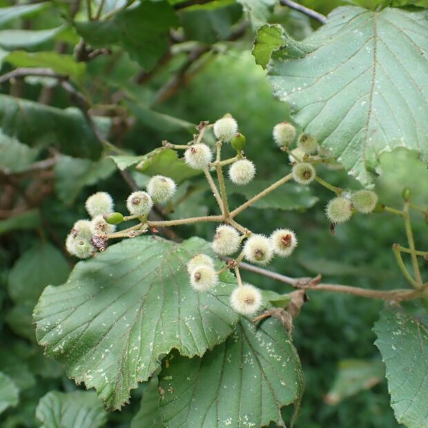 実にできる毛の生えた虫こぶ。 5月頃にあらわれるガマズミミケフシタマバエが産卵することによってできたものです。