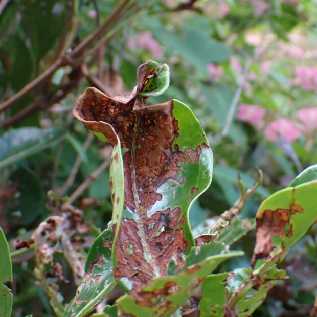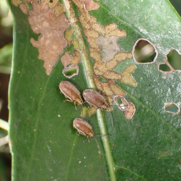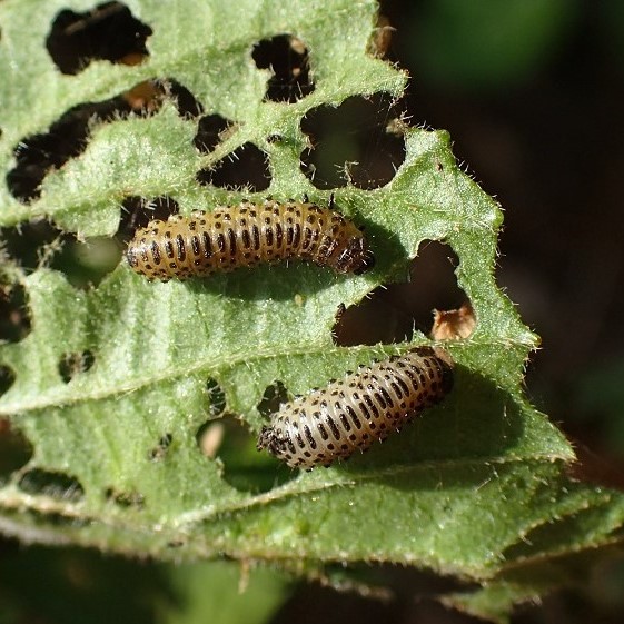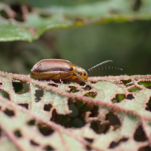 体は淡い褐色で、 頭と胸に黒い模様があるハムシ。 卵で越冬し、 幼虫は4月頃あらわれ、 サンゴジュやガマズミなどの芽吹いたばかりの葉を穴だらけにします。 成虫は6~7月にあらわれて、 葉の内部を食べ、 食べあとは茶色になります。