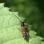 平地~山地に生息するカミキリムシ。 胸は黒色で白い線があり、 茶色の上翅(じょうし)には5対の白い紋があります。 成虫はガマズミ、 タマアジサイなど広葉樹の葉の葉脈を線状にかじり、 夜は明かりにやって来ます。 倒木や伐採木でよく見られ、 幼虫はこれらの材を食べます。