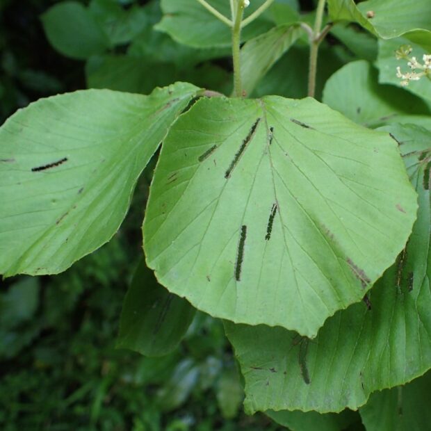 • 成虫の食べあと。 葉脈にそって線状に食べる。 食痕が探す手がかりになる。