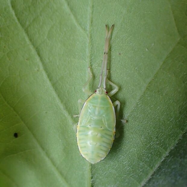 クヌギなどで見られる緑色のカメムシ。 メスは晩秋、 ひも状の卵のかたまりを幹に産みつけます。 卵のまわりはゼリーで包まれ、 春早くあらわれる幼虫のエサになります。 (MT)