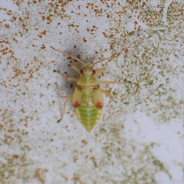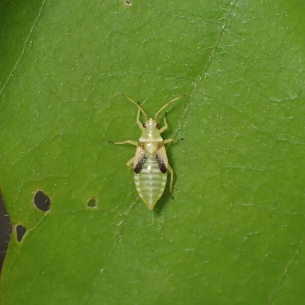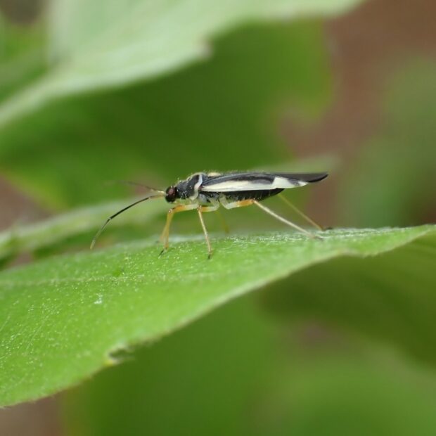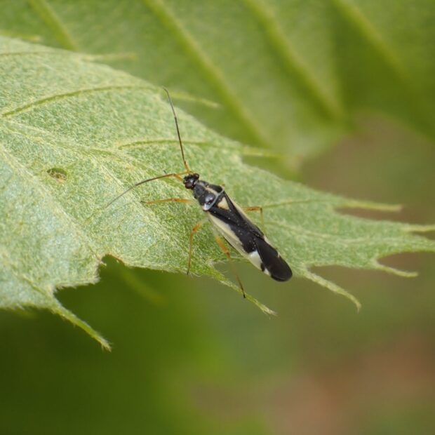 黒色で細長く、 黄色い模様がある毛深いカスミカメムシ。 カスミカメムシは小さなカメムシの仲間で、 単眼がないのが特徴です。 春、 コナラやクヌギなどの葉で見ることができます。