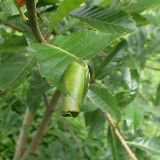 • メスが葉を巻き始めた。 中に卵を産む。 ゆりかごを作るのはメスの仕事。