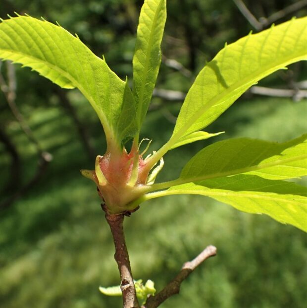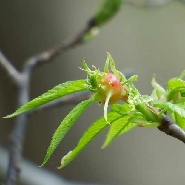 • 芽吹きと同時に赤くふくらむ虫こぶ。