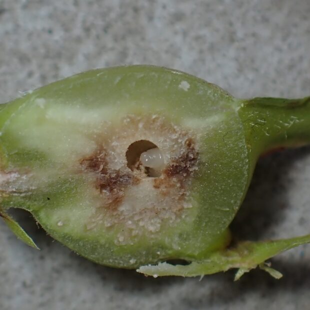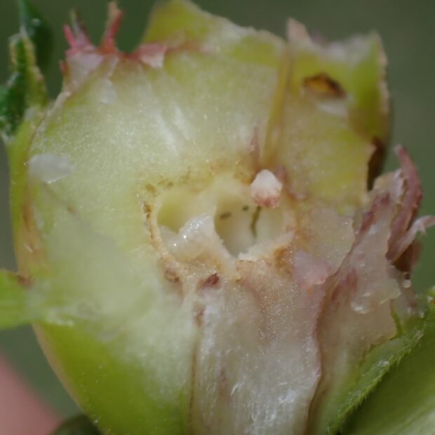 枝先の芽が赤くふくらんだ虫こぶ。 クリタマバチが芽に卵を産みつけることで、 大きくふくらんだもので、 この中でハチの幼虫が育ちます。 虫こぶができるとクリの実ができないことがあります。