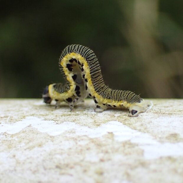 • 幼虫はシャクトリムシ(尺取虫)。 親指と人差し指で尺をとるように歩く。