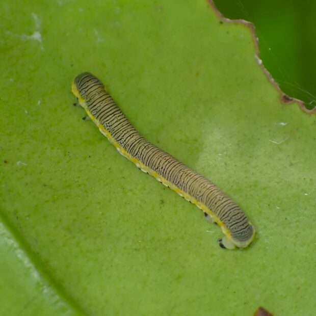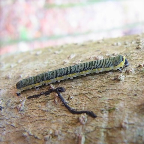 • 幼虫。 頭は黒く背中全体に黒い線。