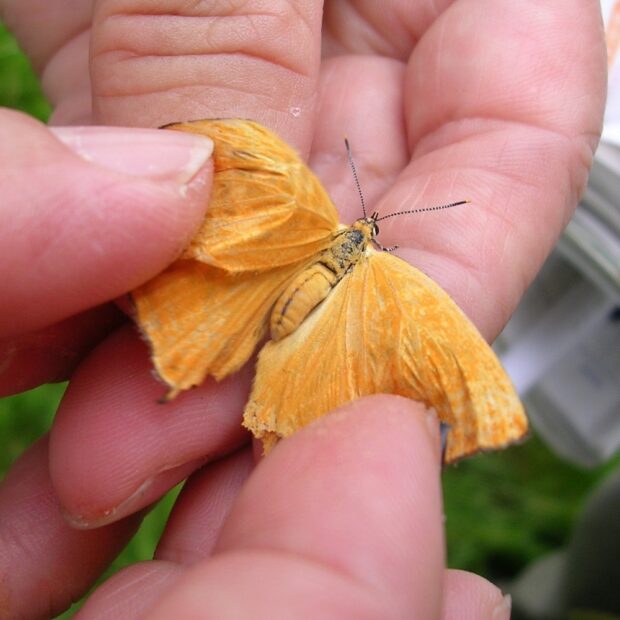 • 成虫。 はねを広げてみると、 表ばねとお腹はオレンジ一色。