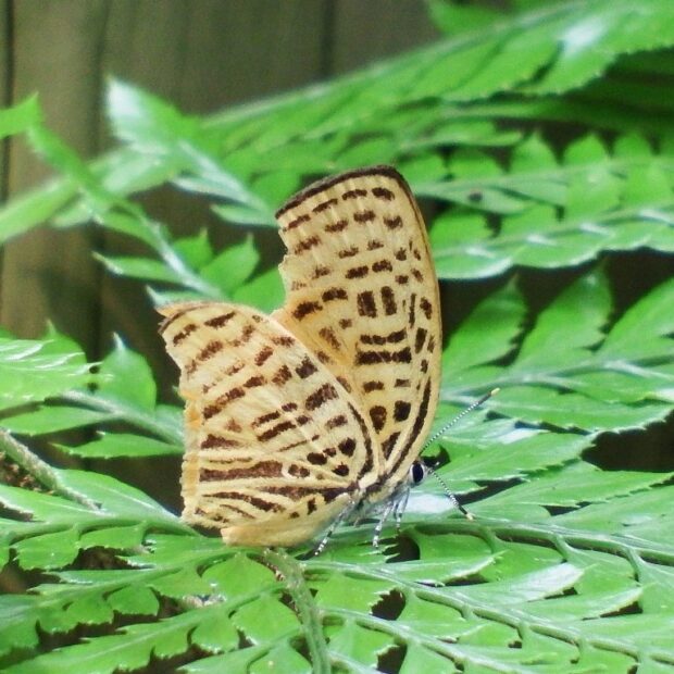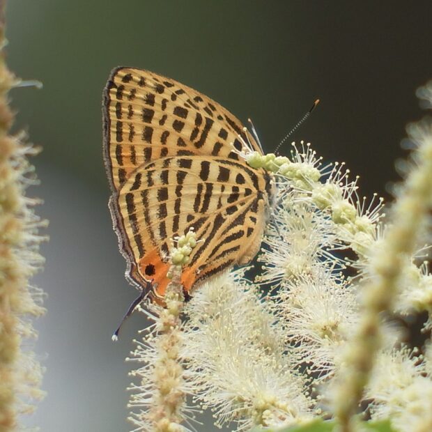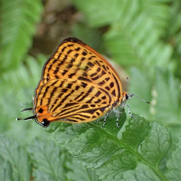 オレンジ色で、 ウラがナミ模様のシジミチョウ