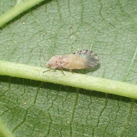 クワにつくキジラミ。 幼虫はお尻に糸のような白いロウ物質をつけて、 フワフワと綿のよう!幼虫は、 集団で葉の汁を吸い、 甘露(かんろ=糖分が多い液体)を出します。 成虫ははねがあり飛ぶことができます。