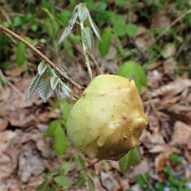 ナラメリンゴタマバチが、 若いコナラなどの冬芽に産卵してできるリンゴのような虫こぶ。 5~6月、 成虫が虫こぶから出てきて、 コナラなどの根に産卵します(根にできる虫こぶをナラネタマフシ)。 季節によって、 産卵場所を変えて虫こぶを作るという複雑な生活をしています。 (MT)