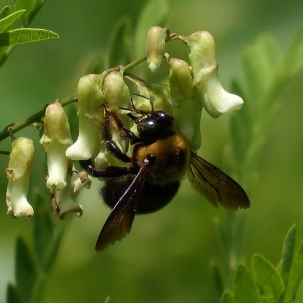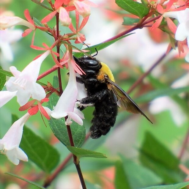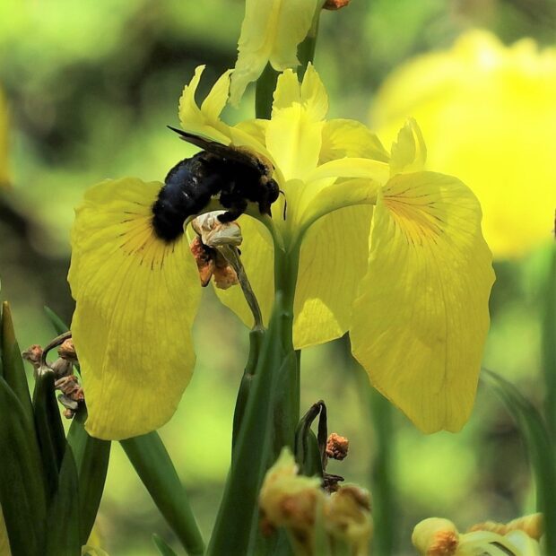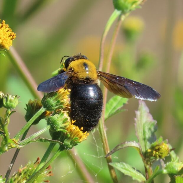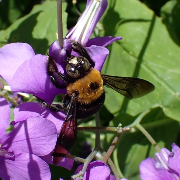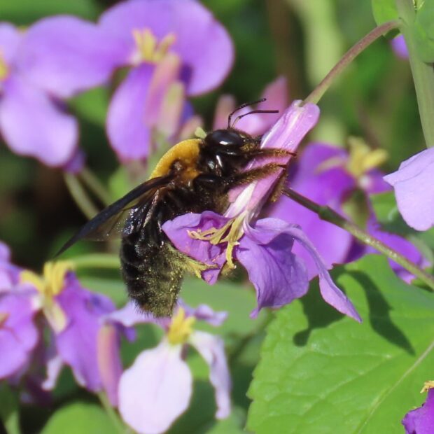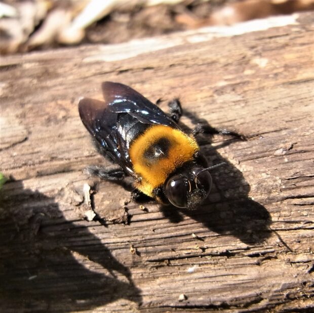 クマンバチとも呼ばれるハチ。 オスは眼が大きく、 顔に三角形の黄色い毛がはえています。 メスの顔は真っ黒です。 春、 「ブーン」と大きな音をたててホバリングしながら飛んでいるのはオスで、 縄張りをつくりメスを待っています。 メスは太い枯れ枝などに巣穴を掘り、 花粉団子を運び、 産卵します。