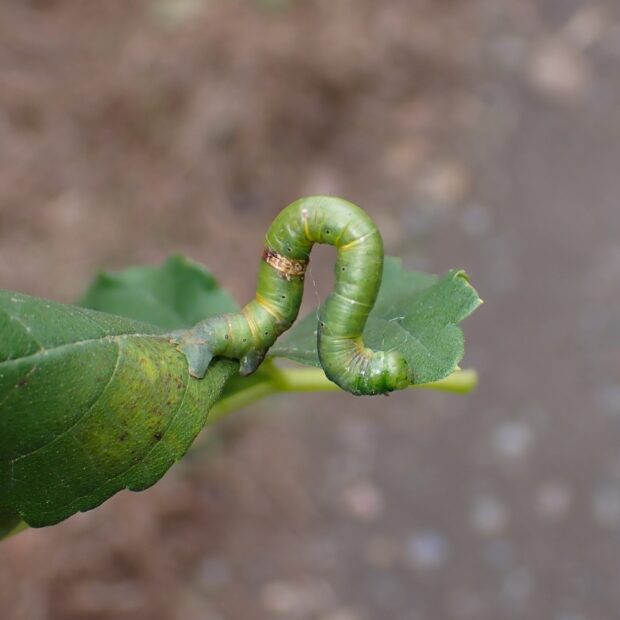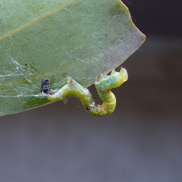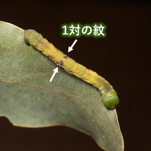 薄い茶色で、 はねの内側半分が半透明になったシャクガ。 透けている部分は鱗粉がありません。 景色にとけ込み、 枯れ葉のよう!とまったときは、 前ばねと後ばねの間にすき間ができて、 バンザイをしているように見えます。