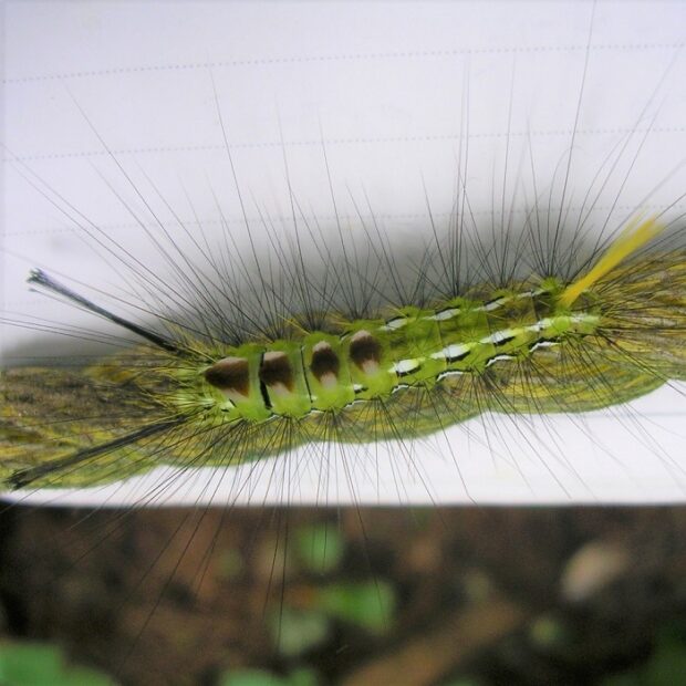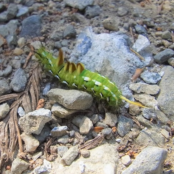 初夏と夏、 2回あらわれるガ。 幼虫は鮮やかな緑色で、 白線があり、 黒い長い毛や歯ブラシのような茶色や黄色の毛束もありカラフルな毛虫。 ドクガの仲間ですが、 毒はありません。 幼虫は、 古くてかたい葉を好んで食べます。 (MT)