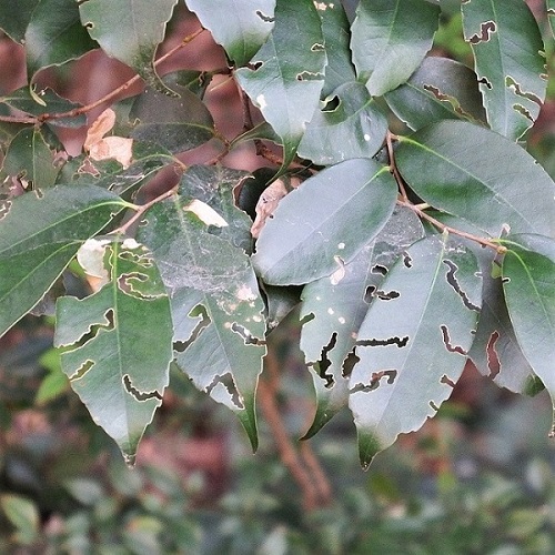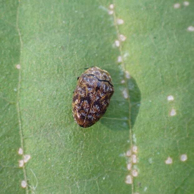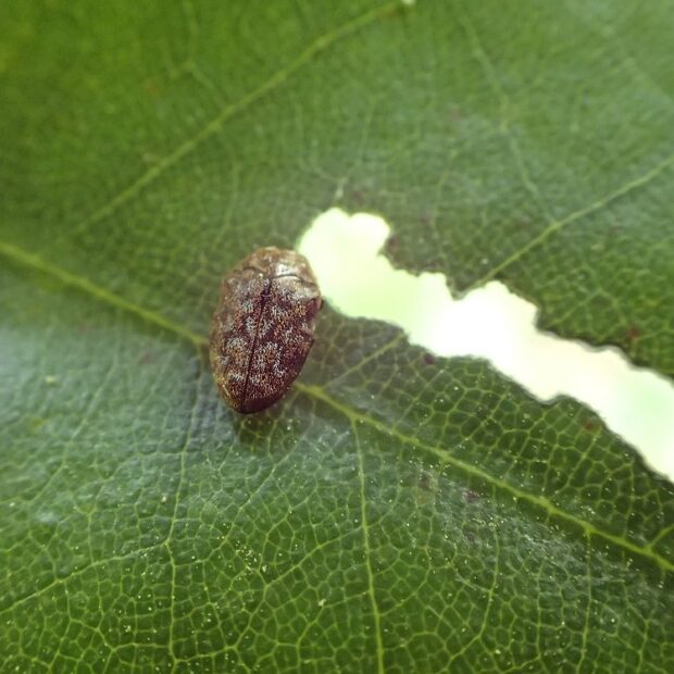 スダジイの葉を食べる小さなチビタマムシの仲間。 街中の公園でも見られ、 成虫が食べた葉の食痕から、 サシゲチビタマムシがいることが分かります。 幼虫は葉に潜り込んで葉肉(葉の表皮の内部)を食べます。