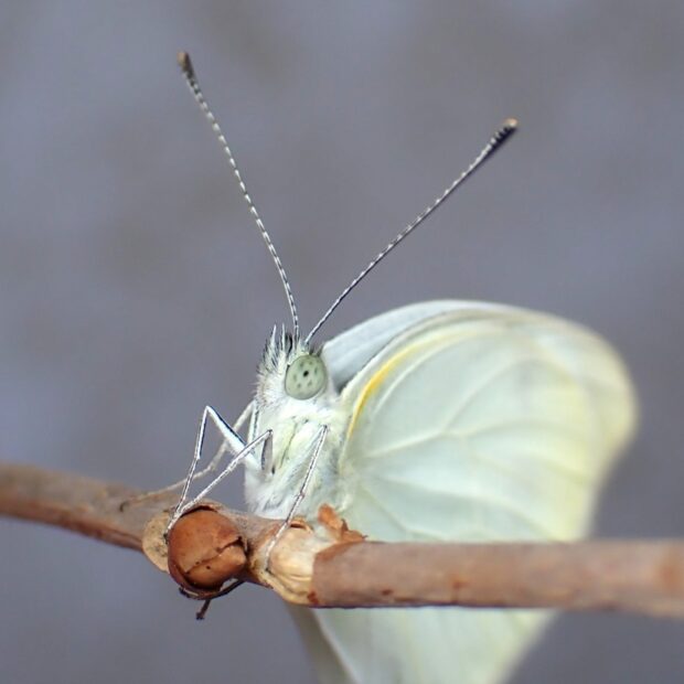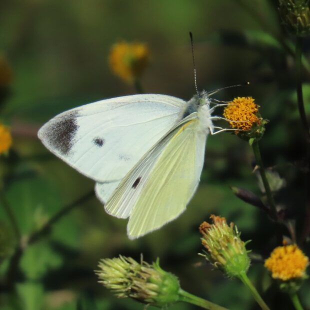 キャベツ畑などをヒラヒラと飛ぶ白いチョウ。 明るい所が好きで、 いろいろな花にやってきます。 幼虫はアブラナ科の栽培種を好みます。 アオムシサムライコマユバチという寄生バチが幼虫に寄生することがあります。