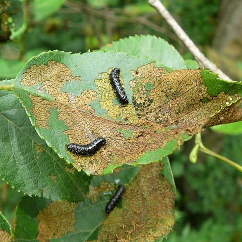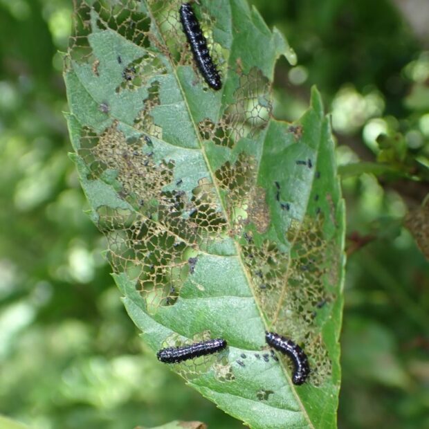 • 幼虫が葉を食べると茶色になる。 葉を網目状に食べる。